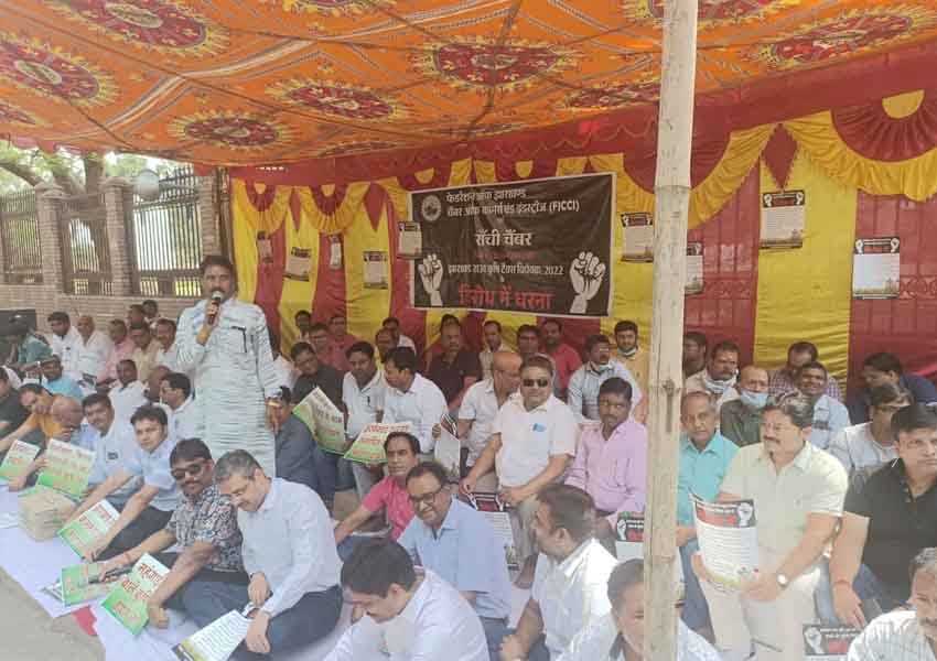रांची: कृषि बाजार (Agricultural Market) शुल्क के विरोध में झारखंड चैंबर ने बुधवार को राजभवन के समीप एक दिवसीय धरना दिया। इस दौरान व्यापारियों ने जमकर विरोध प्रदर्शन किया।
