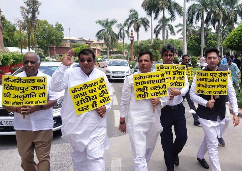 इस मुद्दे को लेकर आप सांसदों ने आज संसद भवन में गांधी प्रतिमा के सामने विरोध प्रदर्शन किया। इस दौरान संजय सिंह ने कहा कि मुख्यमंत्री केजरीवाल को सिंगापुर (Singapore) जाने से रोकना संघीय ढांचे पर चोट है।