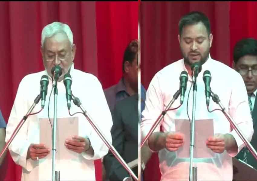 पटना: बिहार में महागठबंधन की नई सरकार में नीतीश कुमार (Nitish Kumar) ने बुधवार को आठवीं बार मुख्यमंत्री पद की शपथ ली। तेजस्वी यादव (Tejashwi Yadav) ने दूसरी बार बिहार के उप मुख्यमंत्री पद की शपथ ली।