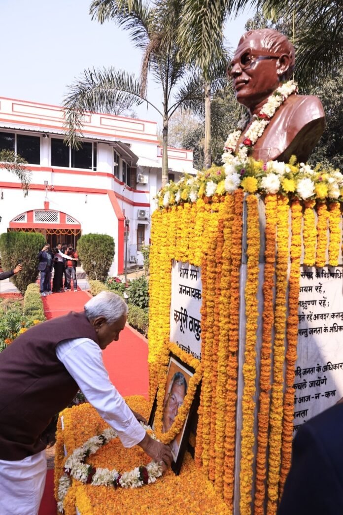 पटना : भारत रत्न जननायक कर्पूरी ठाकुर की पुण्यतिथि पर मंगलवार को देशरत्न मार्ग स्थित जननायक कर्पूरी ठाकुर स्मृति संग्रहालय में आयोजित समारोह में मुख्यमंत्री नीतीश कुमार ने उनकी प्रतिमा पर माल्यार्पण कर अपनी भावभीनी श्रद्धांजलि अर्पित की।