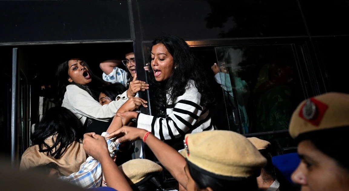 सैकड़ों को बसों में भरकर हिरासत में लिया गया, कुछ को जबरन हटाया। प्रदर्शनकारी बोले, “शांतिपूर्ण विरोध भी नहीं करने देते, लेकिन लोग मर रहे हैं!”