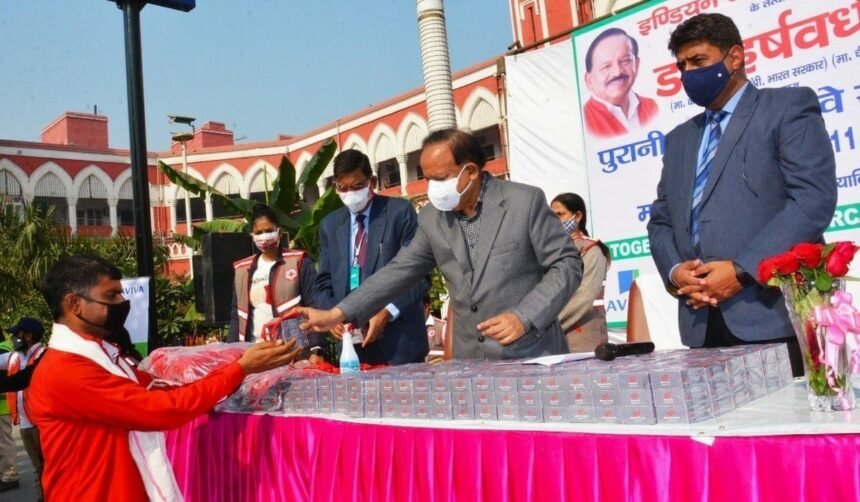 नई दिल्ली: केन्द्रीय स्वास्थ्य एवं परिवार कल्याण मंत्री और इंडियन रेडक्रोस सोसाइटी (ईआरसीएस) के अध्यक्ष डॉ. हर्षवर्धन ने सोमवार को पुरानी दिल्ली रेलवे स्टेशन पर यात्रियों, रेलवे कर्मचारियों, संविदा कर्मचारियों और कुलियों को मास्क और साबुन वितरित किए।