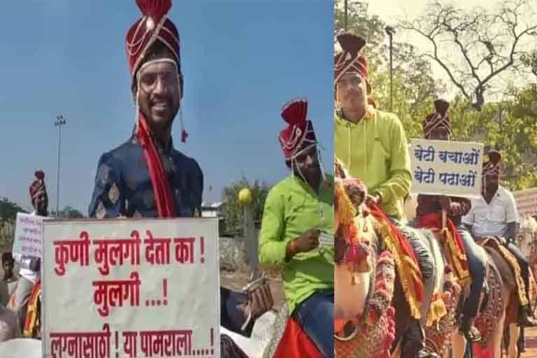 महाराष्ट्र के सोलापुर (Solapur) जिला मुख्यालय (District Headquarters) में दूल्हे (Groom) के लिबास में घोड़ी पर चढ़कर कुंवारे युवकों ने दूल्हा मार्च निकाला।