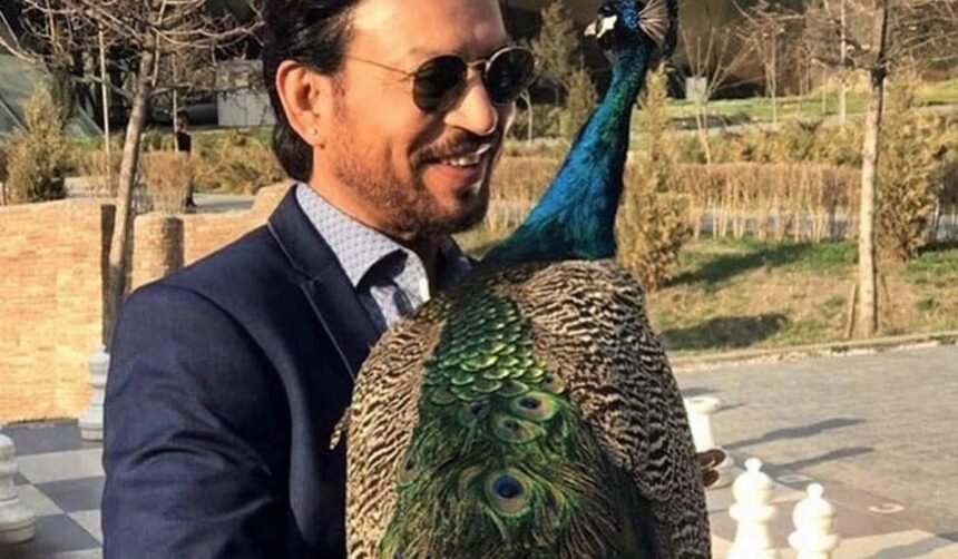 शेयर तस्वीर में इरफान खान नीले रंग के सूट में नजर आ रहे हैं और उनके हाथ पर मोर बैठा है। वह मोर की तरफ देखते हुए मुस्करा रहे हैं।
