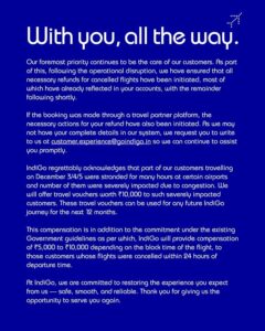 कई दिनों तक चल रही रद्द उड़ानों के बाद कंपनी ने घोषणा की है कि जिन यात्रियों को घंटों एयरपोर्ट पर इंतजार करना पड़ा, उन्हें 10,000 रुपये का ट्रैवल वाउचर दिया जाएगा।