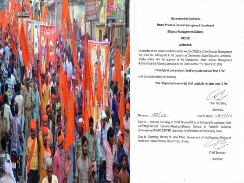 रांची: झारखंड में अब रामनवमी जुलूस रात दस बजे तक निकाला जाएगा। इस संबंध में शुक्रवार को आपदा प्रबंधन विभाग की ओर से आदेश जारी कर दिया गया है।