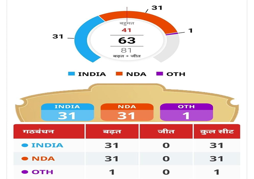 जिनमें NDA और इंडिया गठबंधन दोनों एक दूसरे को जबरदस्त टक्कर देती नजर आ रही है। दोनों ही 31 सीटों पर बढ़त बनाए हुए हैं।