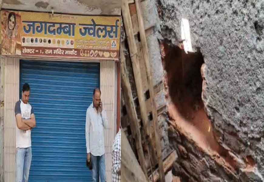 शटर खोलने पर देखा कि शोकेस में रखे सभी जेवरात गायब थे। जांच करने पर दुकान के पीछे की दीवार कटी हुई मिली।
