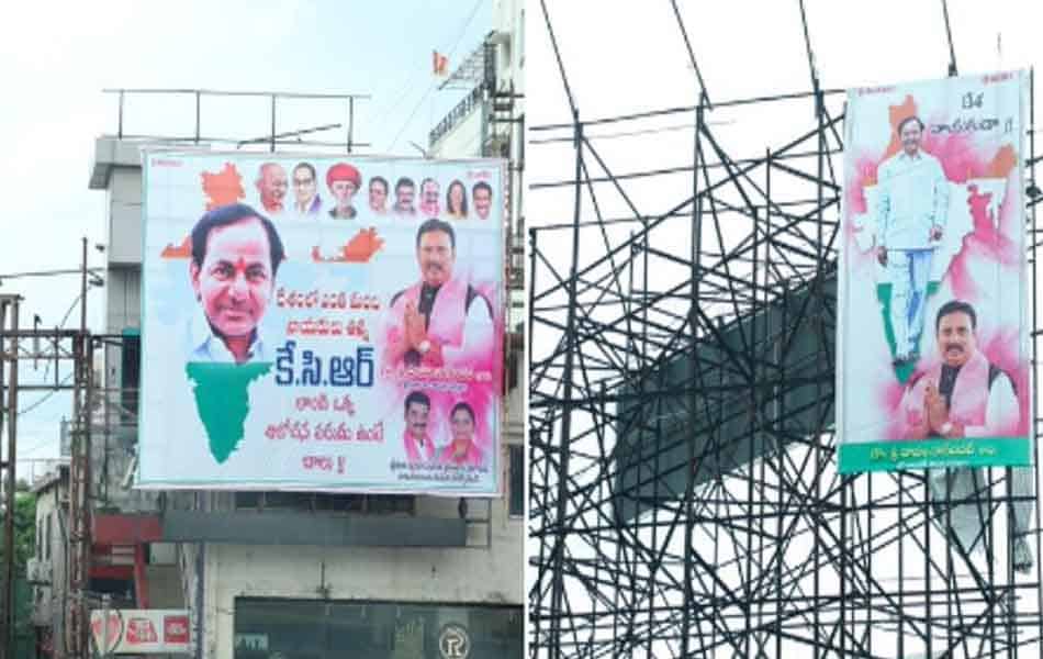 BRS के पोस्टर में मुख्यमंत्री के. चंद्रशेखर राव भारत के नक्शे के बीच नजर आ रहे हैं।