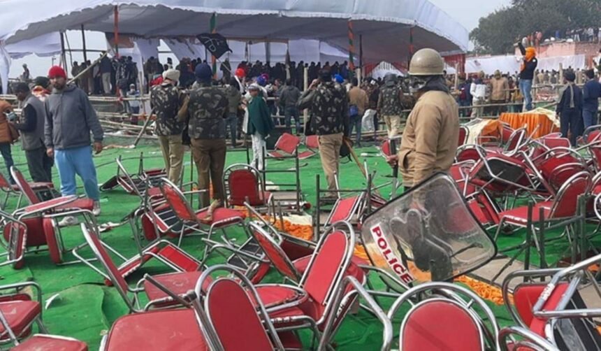 किसान महापंचायत स्थल पर, जब प्रदर्शनकारियों ने आयोजन स्थल में घुसकर तोड़फोड़ की तो बड़ी संख्या में अधिकारियों और कैबिनेट मंत्रियों के अलावा 2,000 से अधिक किसान मौजूद थे।