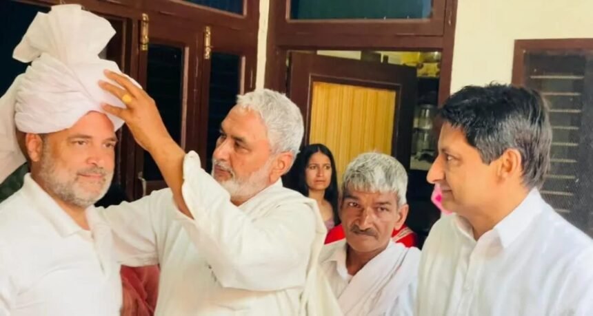 राहुल गांधी हरियाणा के मदीना गांव पहुंचे किसान परिवार की बेटी की शादी में शामिल होने। पारंपरिक स्वागत, पगड़ी और चूरमा के साथ गाँव में उत्साह का माहौल बना।