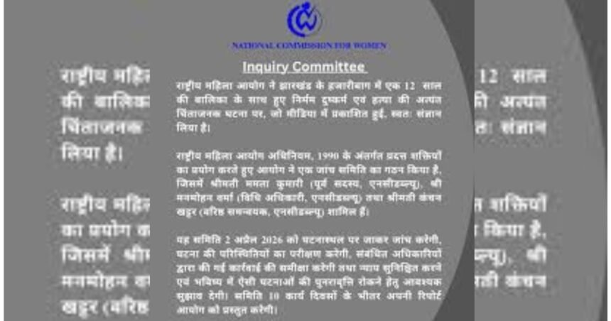 राष्ट्रीय महिला आयोग ने हजारीबाग में 12 वर्षीय लड़की की हत्या की जांच के लिए तीन सदस्यीय समिति बनाई। आरोपियों के खिलाफ त्वरित और सख्त कार्रवाई की जाएगी।