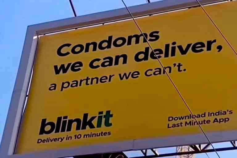 Blinkit के विज्ञापन पर लिखा था, ‘हम कंडोम डिलीवर कर सकते हैं, लेकिन पार्टनर नहीं.’ ये कंपनी 10 मिनट में डिलीवरी करने का दावा करती है